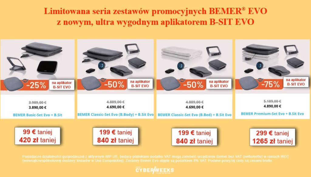 Promocja Black Friday w Bemer potrwa do 8 grudnia lub wyczerpania zestawów promocyjnych. W jej ramach kupując jeden z poniższych zestawów Bemer Evo, zapłacisz nawet do 1.265 złotych taniej, jeśli zdecydujesz się wybrać Bemer Premium-Set Evo + B.Sit Evo. Promocyjna cena aplikatora jest od 25% do nawet 75% niższa!