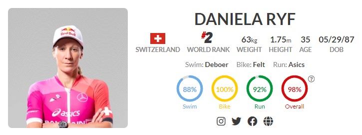 Słynąca z mocnego roweru Daniela Ryf nie zawiodła swoich oczekiwań i oczekiwań kibiców i w drugiej konkurencji wykręciła najlepszy czas (1:51:48). Po pływaniu Szwajcarka traciła do Flory Duffy ponad 20 sekund, jednak szybko dogoniła swoją rywalkę. Ostatecznie Ryf w drugiej strefie zmian miała nad Duffy ponad 6 minut przewagi.