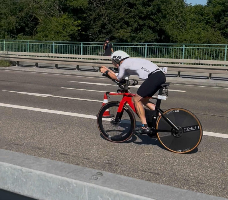 PG: Start we Frankfurcie dostarczył mi dużo cennego feedbacku na temat aktualnej formy oraz elementów, nad którymi warto jeszcze popracować. Był to start kontrolny, którego głównym celem było zebranie informacji do dalszych przygotowań – i ten cel udało się w pełni zrealizować. Pływanie odbywało się bez pianek ze względu na wysoką temperaturę wody. Nie posiadam swimskina, więc musiałem radzić sobie bez dodatkowego wsparcia. Biorąc pod uwagę, że pływać nauczyłem się dopiero, zaczynając przygodę z triathlonem, ten etap zawsze był dla mnie pewną niewiadomą.