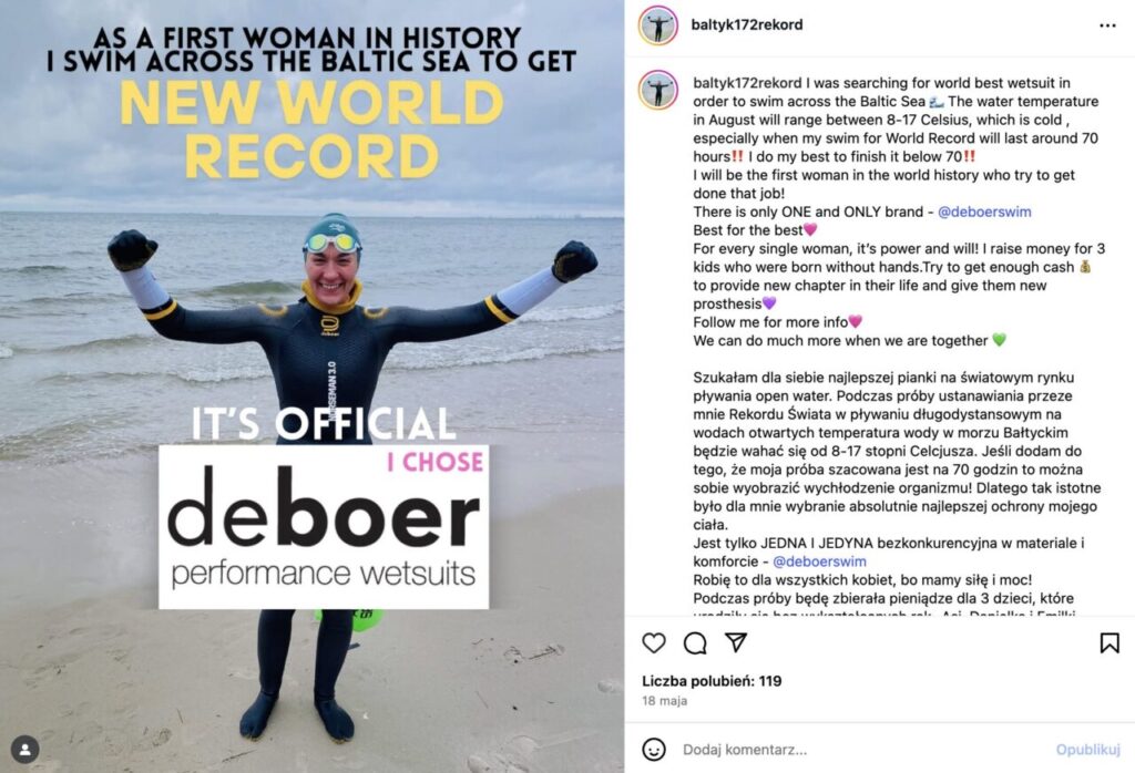 – Szukałam dla siebie najlepszej pianki na światowym rynku pływania open water. Podczas próby ustanawiania przeze mnie rekordu świata w pływaniu długodystansowym na wodach otwartych temperatura wody w Morzu Bałtyckim będzie wahać się od 8–17 stopni Celsjusza. Jeśli dodam do tego, że moja próba szacowana jest na 70 godzin, to można sobie wyobrazić wychłodzenie organizmu! Dlatego tak istotne było dla mnie wybranie absolutnie najlepszej ochrony mojego ciała. Jest tylko JEDNA I JEDYNA bezkonkurencyjna w materiale i komforcie – deboer – wskazuje Szczepaniak.