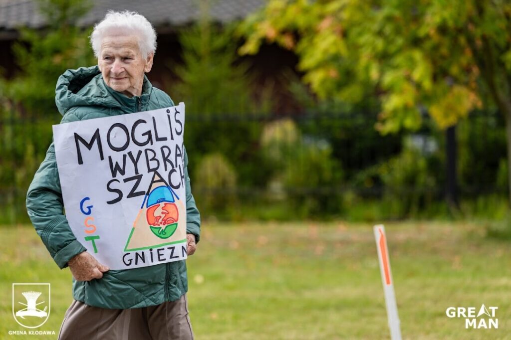 A poniżej wielka fanka triathlonu – prababcia Janka (tutaj znajdziesz ją na Instagramie). Zawsze na zawodach wspiera swoje prawnuki, a podczas zawodów w Kłodawie trzymała wymowną planszę z napisem… „Mogliście wybrać szachy”.