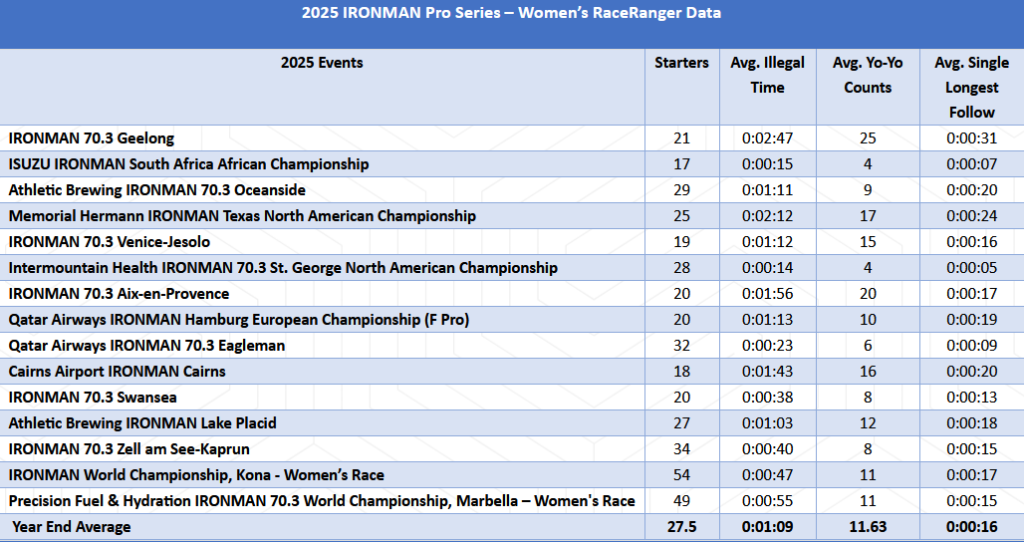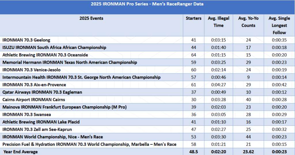 Dwa lata temu RaceRanger wszedł na stałe do wyścigów PRO IRONMAN. Od tego momentu na wyścigach zbierane są dane od poszczególnych zawodników. Według najnowszego raportu za zakończony sezon drafting zmniejszył się o ponad 25% w porównaniu z 2024 rokiem.