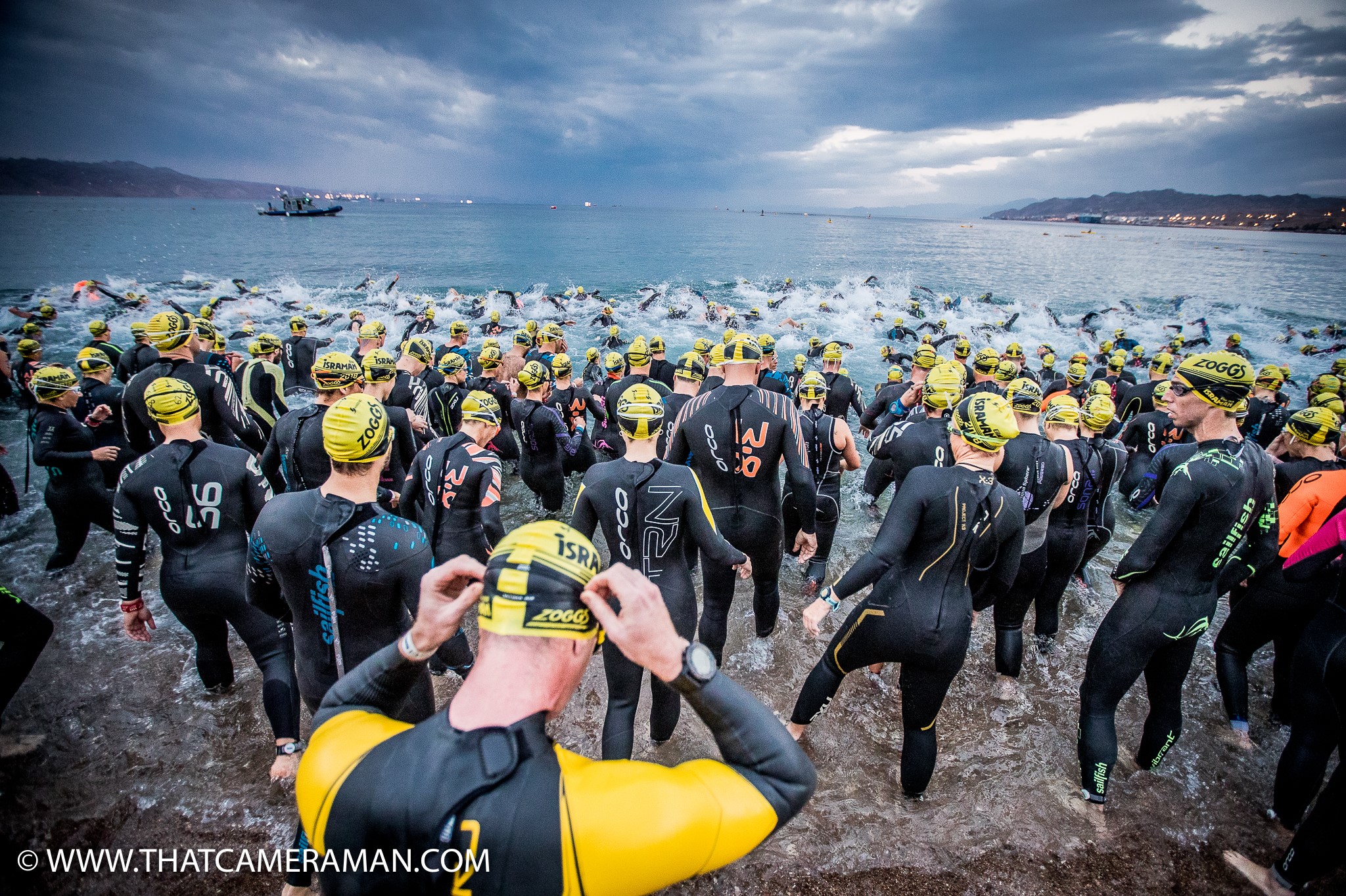 Zawody rozpoczęły się o godzinie 6.20. Jeszcze dwadzieścia minut przed startem można było odnieść wrażenie, że zawodnicy będą płynąć w ciemności, ale w pewnym momencie, jak na zawołanie, zrobiło się jasno. Słońce, którego tego dnia było jak na lekarstwo, wzeszło bardzo szybko. Było „chłodno” jak na Izrael, ale w końcu mamy zimę. Temperatura powietrza około 12 stopni Celsjusza. Woda 23 stopnie. Pływanie w piankach. Pętla 1900 metrów, zawodnicy z długiego dystansu pokonywali ją dwa razy, wybiegając z wody po pierwszej pętli.