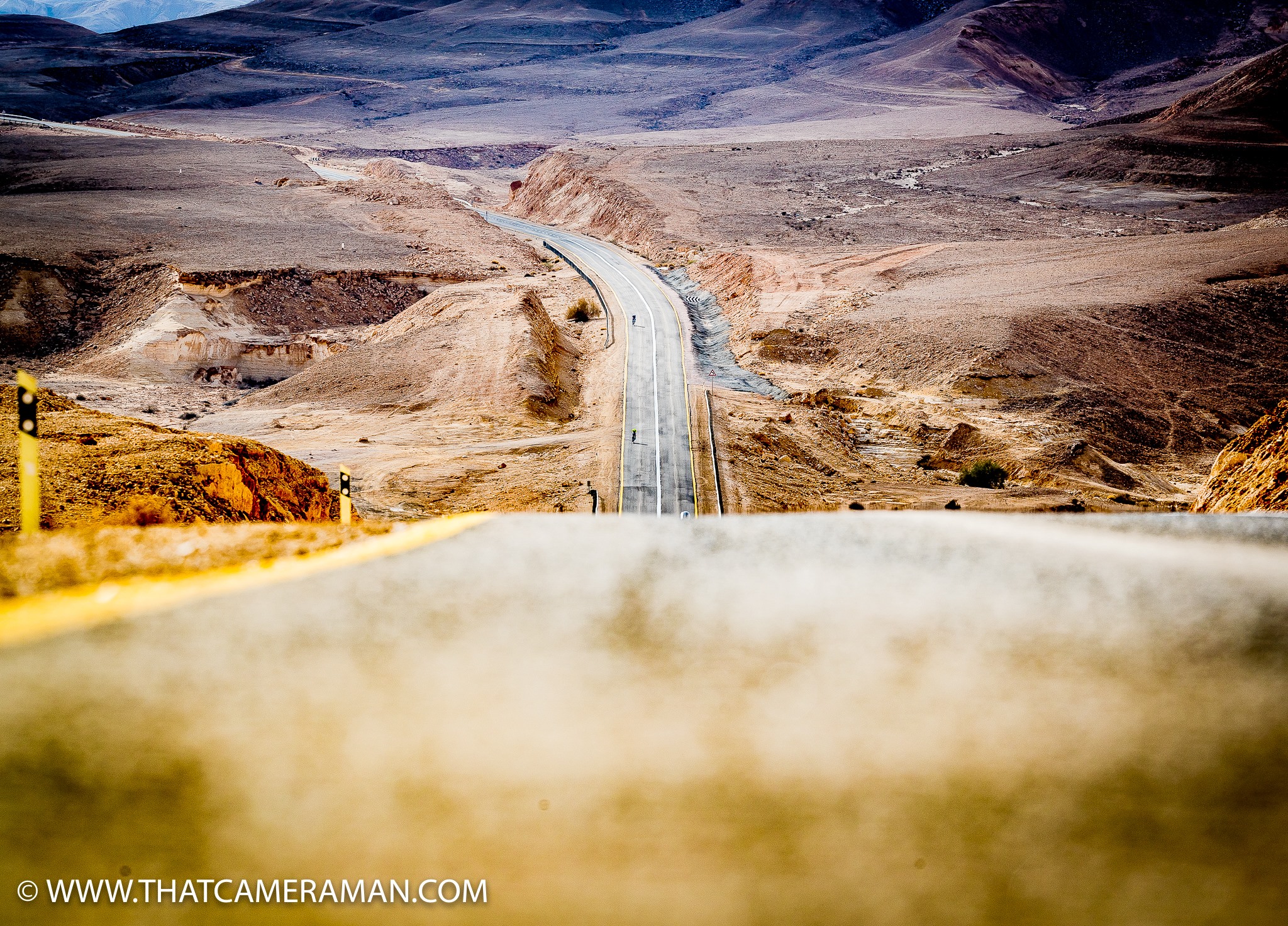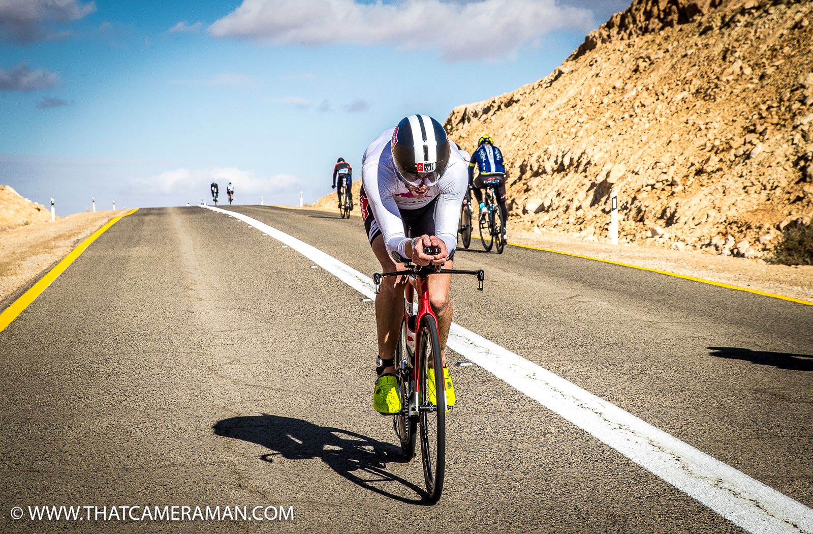 Początkowy odcinek trasy rowerowej, zaraz po wyjeździe z miasta, to stromy podjazd, ze szczytu którego widać zatokę Akaba między półwyspami Arabskim i Synaj oraz dolinę Arava. Region znany jest z porywczego wiatru, a na całej trasie widnieją duże znaki drogowe ostrzegające przed cross winds, niczym na Hawajach. O sile tego wiatru przekonał się niejeden triathlonista, który starał się pokonywać zjazdy leżąc na lemondce. Czasami opanowanie roweru podczas porywistych podmuchów staje się niemożliwe. Ale zdarzały się osoby, które jechały na dyskach. Wieczorem po zawodach, w gronie dziennikarzy z Niemiec, UK i USA byliśmy zgodni, że jazda na dyskach powinna być na zawodach Israman zakazana (podobnie jak na Hawajach).