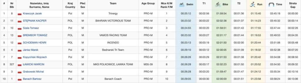 Rywalizacja między Krawczykiem a Stępniakiem toczyła się do samego końca, a o mistrzowskim tytule zadecydował sprint na ostatnich metrach. Ostatecznie Krawczyk utrzymał pozycję lidera i z czasem 03:45:18 został mistrzem Polski na dystansie średnim! Czas Krawczyka jest też nowym rekordem trasy JBL Triathlon Sieraków!