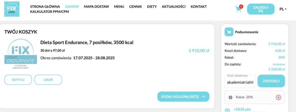 Dlatego w lipcu zwiększamy nasz rabat! Przy zamawianiu diety Fix Catering użyj kodu akademiatriathlonu i zgarnij 20% rabatu, zamiast 15%. Zniżka obejmuje wszystkie zestawy (z wyłączeniem produktów BOX, diety CARB LOADING, BODY BUILDING, HIGH PROTEIN oraz FITNES PLUS).