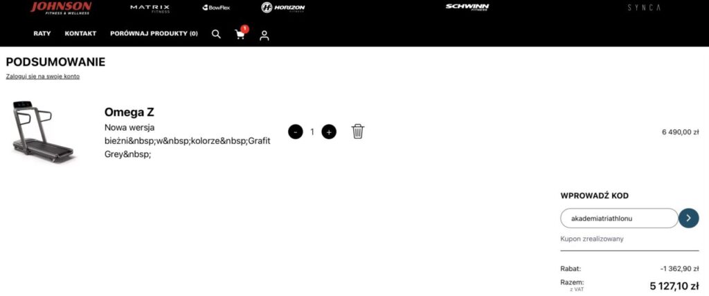 Jeśli chcesz doposażyć swoją „jaskinię” treningową lub wymienić sprzęt – to najlepszy moment. Właśnie ruszyła największa promocja w roku. Z kodem akademiatriathlonu kupicie wszystko 21% taniej. Brzmi mało obrazowo? Na bieżni Horizon Omega Z zaoszczędzicie blisko 1400 zł.