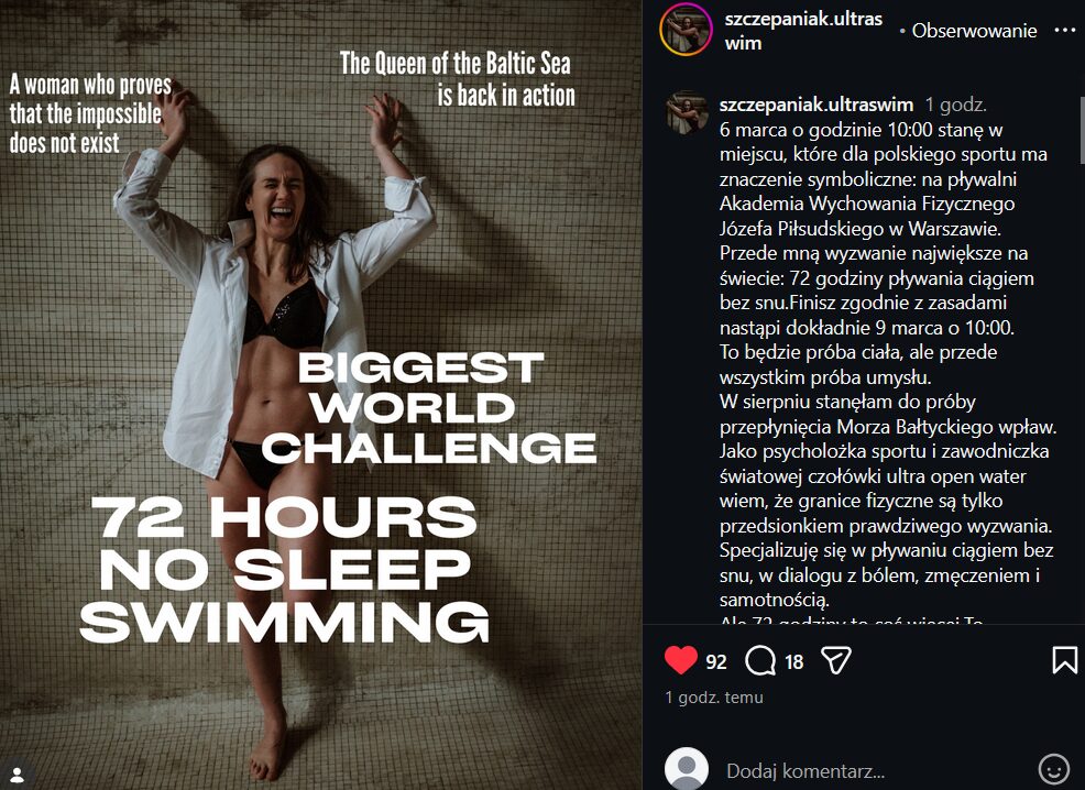 Ultrapływaczka zamierza rozpocząć swoją próbę 6 marca o 10:00. Wydarzenie będzie odbywało się na pływalni Akademii Wychowania Fizycznego im. Józefa Piłsudskiego w Warszawie. Cel? Płynąć przez 72 godziny ciągiem bez snu. Jak pisze Karolina, będzie to próba ciała, ale przede wszystkim umysłu.