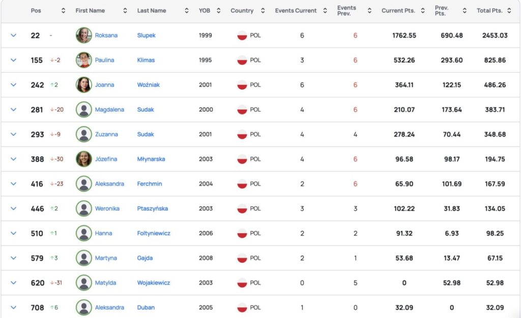 Najwyższą pozycję w rankingu World Triathlon spośród wszystkich reprezentantów Polski zajmuje Roksana Słupek. Triathlonistka znajduje się obecnie na 22. miejscu. Jeszcze w kwietniu 2025 zajmowała 29. miejsce, jednak od tego czasu zaliczyła kilka bardzo udanych startów. Za puchar świata w Chengdu, w którym zdobyła srebro Słupek zyskała aż 462.5 punktów. Oprócz tego dołożyła 362.95 punktów za WTCS Yokohama (14. miejsce) oraz 245.78 za WTCS Alghero (19. miejsce).