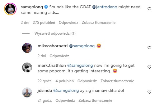Riposta Sama Longa nie była już taka mocna. Amerykanin zasugerował tylko, że – (…) GOAT [największy zawodnik wszech czasów – przyp. red] Jan Frodeno może potrzebować aparatu słuchowego.