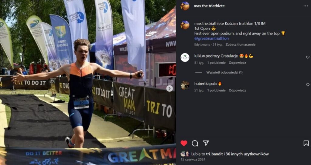 Jedną z nich był Maksymilian Grycz. Triathlonista z czasem 1:05:38 wygrał zawody, notując czołowe czasy w każdej z konkurencji. W rozmowie z Akademią Triathlonu mówi, że triumf miał specjalny wymiar.
