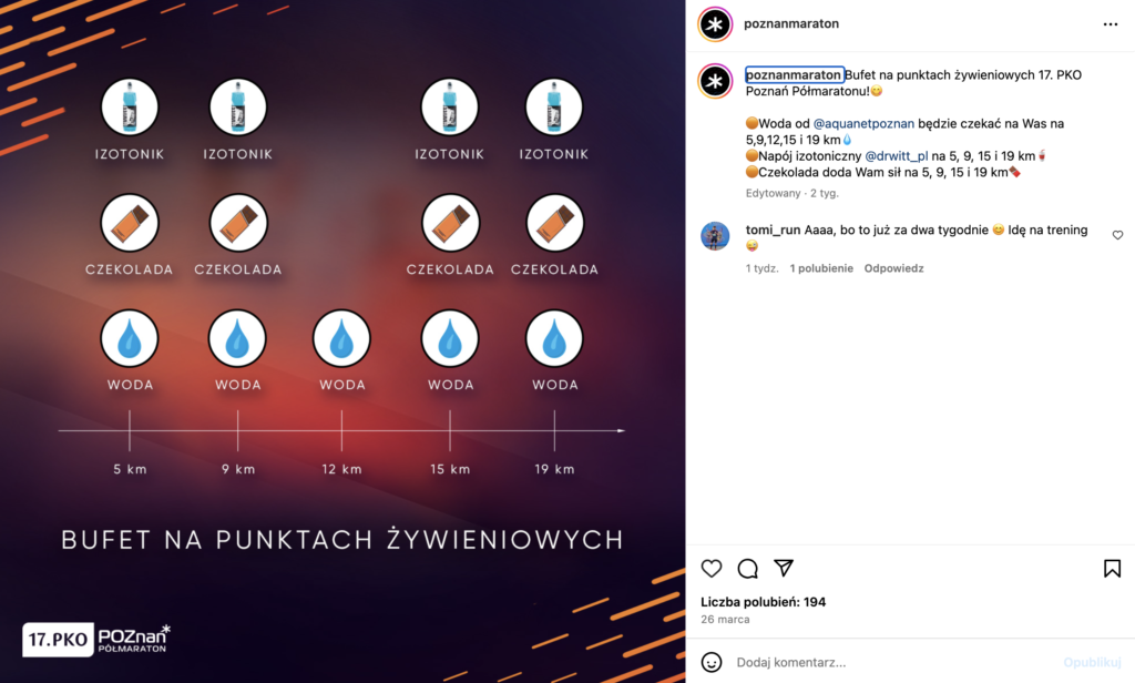Na trasie 17. PKO Poznań Półmaratonu punkty żywieniowe rozstawione będą na 5, 9, 15 i 19 km. Będziecie mogli napić się wody oraz izotonika, a także… zjeść czekoladę. Jej obecność w punktach odżywczych może zaskakiwać, jednak ma swoje uzasadnienie.