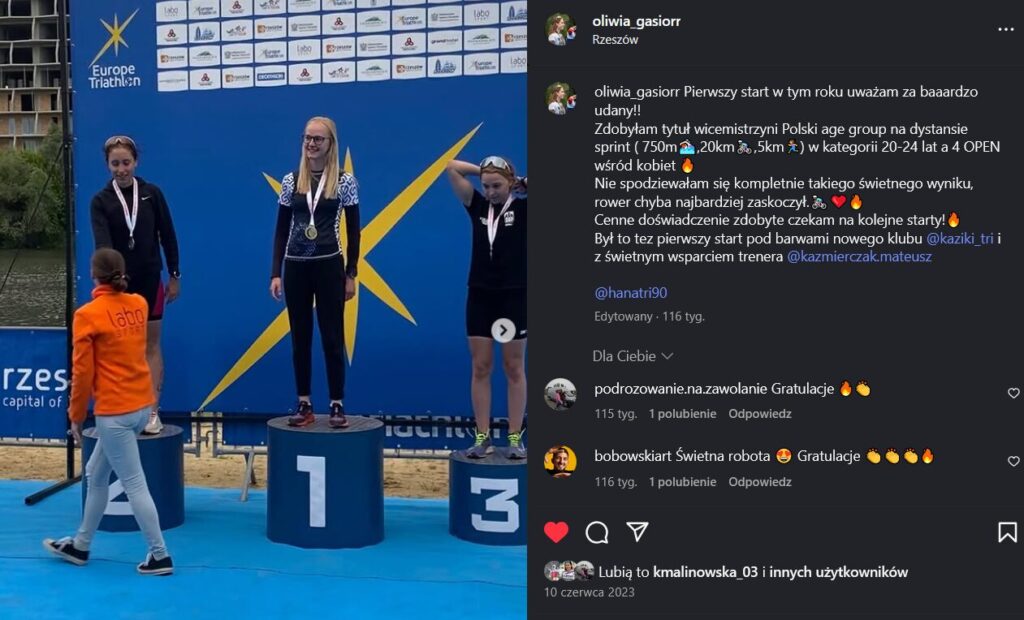 Oliwia, jak wielu zawodników, wrzuca podsumowania wyścigów i zdjęcia w mediach społecznościowych. Jakiś czas temu poszła jednak krok dalej i swoim triathlonowym życiem zaczęła się dzielić na TikToku. Dodaje tam krótkie, często zabawne filmiki z życia sportowca.
