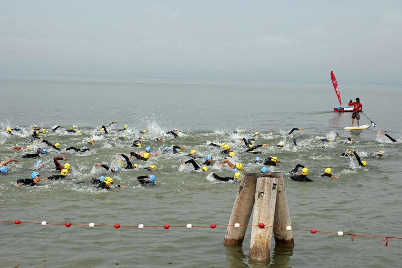 pierwszy start w triathlonie – zawodnicy przed wejściem do wody