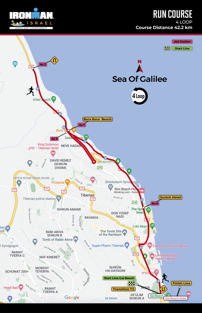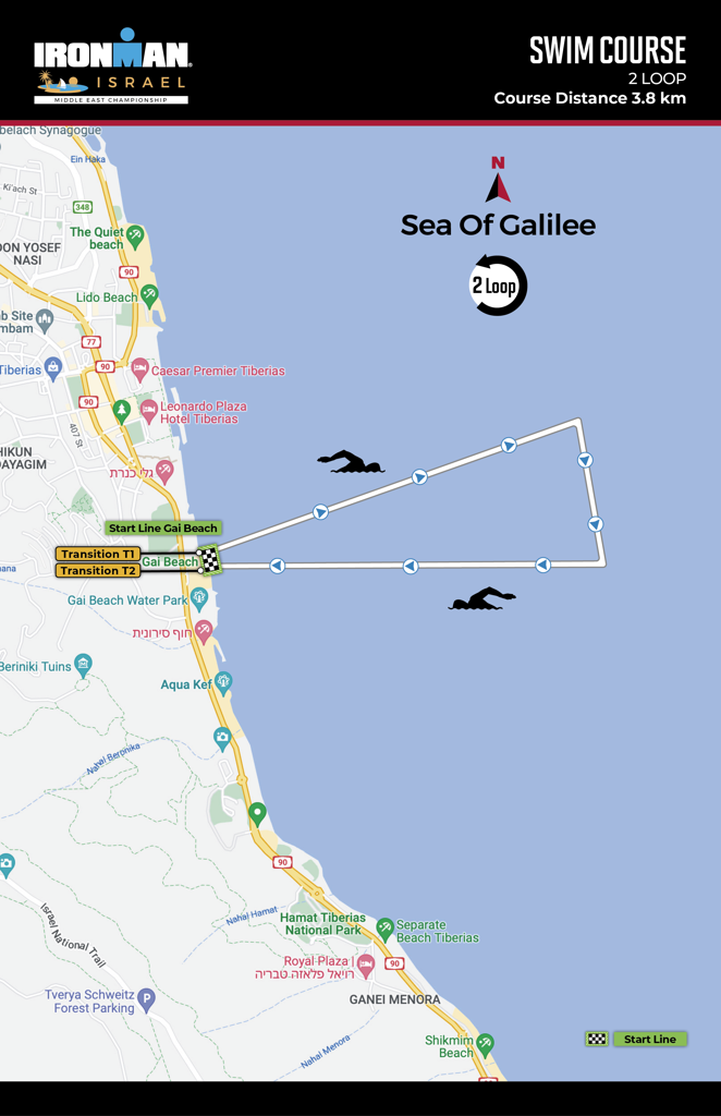 Miejscem rozgrywania zawodów jest Tybieriada – miasto położone nad Jeziorem Galilejskim. Do pokonania jest 3,8 km pływania, 180 km na rowerze oraz 42,2 km biegu. Start i meta zawodów usytuowane są na plaży Gai. Mężczyźni wystartują o godz. 06:15, a kobiety o godz. 06:17. Zawodnicy AG wyruszą na trasę o godz. 06:20.