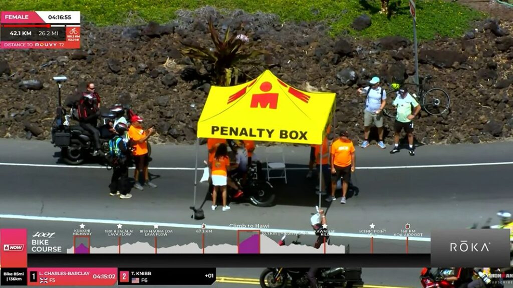 Podjazd na Hawi znacząco zmienił sytuację! Na przestrzeni kilku kilometrów Taylor Knibb odrobiła praktycznie całą stratę do Charles-Barclay. Zawodniczki jechały blisko, ale około 120 kilometra Taylor Knibb zaatakowała i zaczęła uciekać rywalce. Ta jednak nie zamierzała za bardzo zostawać i jechała dość blisko, tracąc kilka sekund.