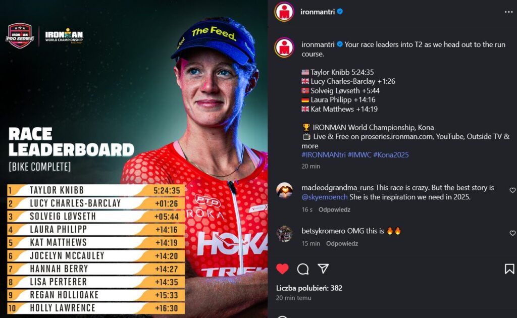 Ponad 50 PRO zawodniczek wystartowało w mistrzostwach świata IRONMAN na Hawajach. Przed biegiem przewagę kilku minut nad Solveig Lovseth miały Lucy Charles-Barclay i Taylor Knibb, ale mało kto mógł przewidzieć, co zdarzy się dalej. Obie te zawodniczki nie wytrzymały trudów wyścigu, co perfekcyjnie wykorzystała Norweżka. Z czasem 8:28:27 wygrała w swoim debiucie!