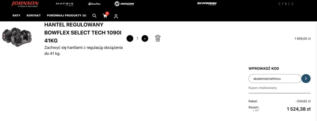 Co istotne z naszym kodem „akademiatriathlonu” otrzymasz aż 18% zniżki na wszystkie sprzęty na stronie Johnson Fitness. Rabat obejmuje również hantle, gryf oraz kettlebell firmy Bowflex.