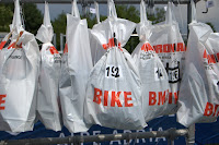 Widzę wolontariuszy, pomagający wyjść z wody zawodnikom. Ech co za wafle, ja wyjdę sam, bez pomocy. Pierwszy krok na podwyższeniu, łup! Wstaję, łup! Łapię się ręki wolontariusza, który wyciąga mnie na górę. No dobra jestem waflem … jaki mam czas? Godzina dziesięć. Jeszcze miesiąc temu był to czas docelowy, jednakże po zawodach w Mortizburgu miałem ochotę na dwie-trzy minuty lepszy czas. Żadna strata. Torbę z rzeczami na rower znajduję bez problemu. Ludzie z dyskami już pojechali, mieli numery 191 i 193 – ich toreb już nie było. Zakładam kask, okulary, numer startowy na plecy, to już wszystko? Oglądam zawartość torby jeszcze dwa razy, lepiej stracić 10 sekund, niż zapomnieć czegoś niezbędnego. Chyba tak. Zabieram skondensowany magnez[3]i żel energetyczny i wybiegam z namiotu. Bieganie na bosaka po asfalcie jest nieprzyjemne, ale przypięcie butów do roweru jest znacznie lepsze od biegania w butach kompletnie i absolutnie do tego nieprzystosowanych. Jadę bez skarpetek, sprawdziłem – nie ma różnicy, buty ułożone są idealnie i nie obcierają. Włączam pulsometr i w drogę.