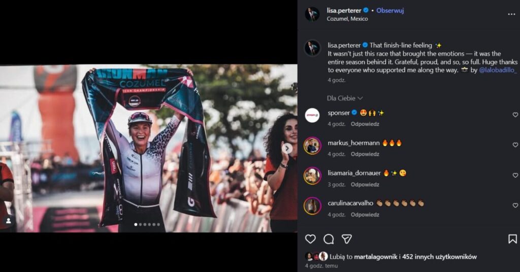 Kilka dni temu Lisa Perter odniosła swoje pierwsze zawodowe zwycięstwo – wygrała IRONMAN Cozumel (8:29:29), wyprzedzając Sarę Svensk oraz Martę Łagownik. Świętowanie popsuł jednak fakt, że zawodniczka… nie otrzymała slota na mistrzostwa świata w Konie. Spóźniła się na ceremonię po zawodach!