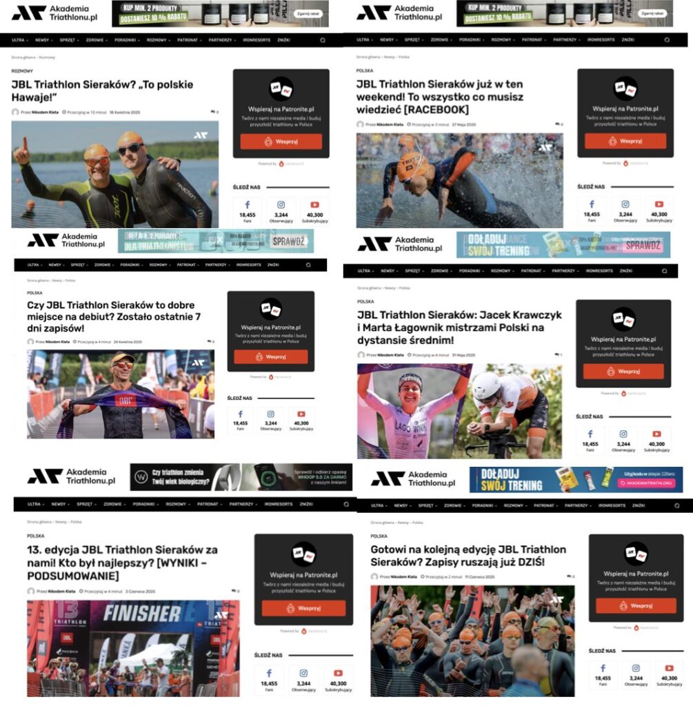 W 2025 Akademia Triathlonu objęła patronatem medialnym kilkanaście imprez. Od największych triathlonowych zawodów w Polsce, przez lokalne i debiutujące imprezy. Efektem współpracy są setki tekstów, działań w mediach społecznościowych, a także filmy dokumentalne i specjalne relacje.